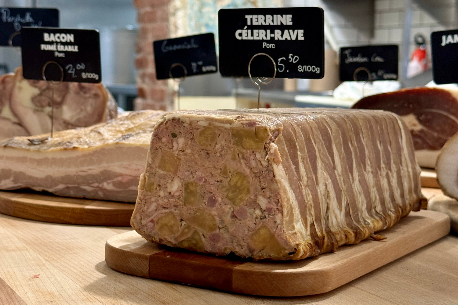 Nous préparons nous-mêmes les charcuteries cuites : bacon, jambon, porchetta, pâtés, rillettes, et autres, sans utiliser de nitrate. Nous complétons notre offre avec les charcuteries sèches de chez Cochon Tout Rond et Rheintal.